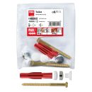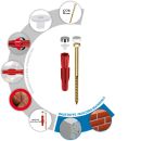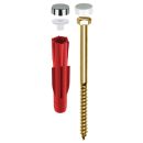 • Zwei Tri-Dübel (8/51), zwei Kunststoff-Unterlegscheiben mit Bund, Messing-Sechskantschraube (SW 10) und Abdeckkappen weiß und/oder verchromt