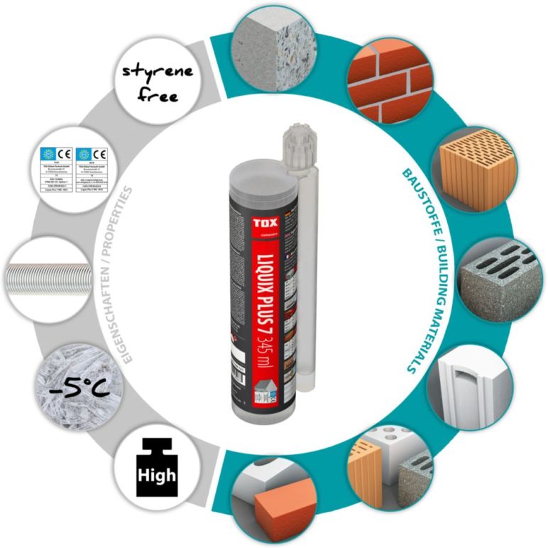 - Zugelassen in Verbindung mit handelsüblichen Gewindestangen oder TOX Gewindestange Stix