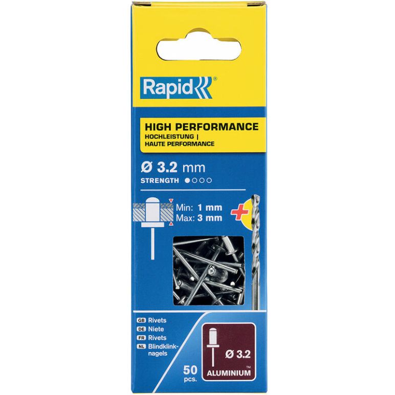 Blister 50 Nieten ø3,2x6mm. alu + Bohrer 5001528 rapid. Diese Hochleistungsnieten aus Aluminium eignen sich perfekt für die Befestigung von Materialien an exponierten Stellen, wie z.B. Kotflügeln, Metall- und Kunststoffverkleidungen, Schildern und Metallschildern. Ein Bohrer der entsprechenden Größe ist in der Verpackung enthalten.