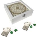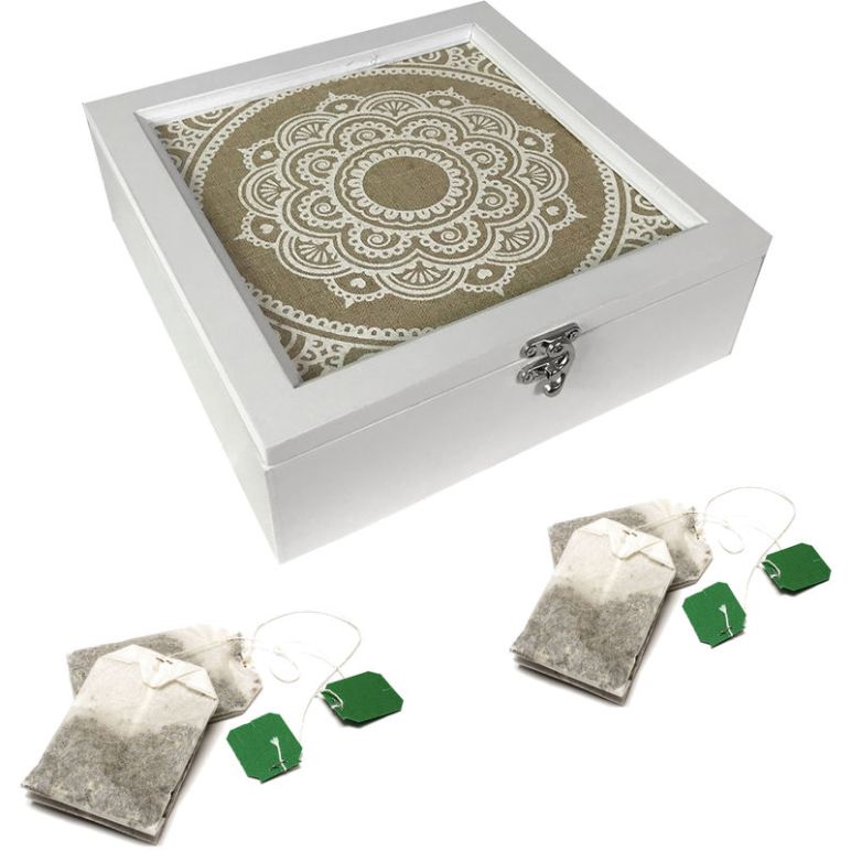 """Teebox Holz für 9 Sorten Die schönen Tee-Box überzeugen mit ihrem nostalgischen Look, der sich stilsicher in Ihre Küchen- und Wohnungseinrichtungen einfügen lässt. Zusätzliche Eleganz strahlt die Teekiste zudem noch durch das schöne Dekor auf dem Deckel aus. So erweisen sich diese Teeboxen mit und ohne Inhalt nicht nur als praktische Aufbewahrungs-Box, sondern auch als echter """"Hingucker""""! Sie eignet sich auch hervorragend als kleines Geschenk für alle die gerne Tee trinken. Diese Teebox mit ihren 9 Fächern eignet sich nicht nur für eine sichere Aufbewahrung von Tee in Form von Teebeuteln und losem Tee, sondern auch für eine praktische Sortierung nach Geschmacksrichtungen und Tee-Sorten. Dank des Deckels mit Haken-Schließe eignet sich die Tee-Box alternativ auch zur Aufbewahrung von allen anderen Kleinteilen. Details: - Maße: ca. 24x24x8cm (LxBxH) - 9 Fächer - Deckel mit schönem Dekor und Haken Verschluss - Material : Holz - Farbe Weiß/Natur Shabby Look Formschöne Holz-Box für die"""