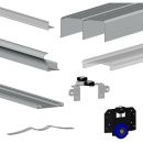 Schiebetürsystem für Schränke, mit Schiene in silber, 300 cm breit, für 3 Schiebetüren (erweiterbar) aus Holz bis je max. 50 kg. Empfohlen für Schränke, Schranktüren, Kleiderschränke, Nischen Produktinformationen: Laufschiene 300 cm Montage von Glaselementen oder Spiegeln möglich ohne Zubehör Material: Aluminium eloxiert Farbe: Aluminium eloxiert / silber für 3 Türen (erweiterbar), Holz Modell: Laufschienen oben und unten, bodenläufiges System max. Gewicht pro Tür: 50 kg Türstärke: 18 mm geprüft und zertifiziert auf 100000 Öffnungs- und Schließzyklen gemäß EU-Norm EN 1527-12 Achtung: nur für den Innenbereich geeignet BITTE BEACHTEN: Für die Speditionslieferung bitte unbedingt eine Telefonnummer angeben! Inhalt: 1 obere Schiene mit integrierter Blende, Länge 300 cm 1 untere Schiene, Länge 300 cm 3 T-Profile, Länge 200 cm 6 Griffprofile, Länge 270 cm 6 obere Laufwagen 6 untere Laufwagen 3 Stopper Schrauben Optionen: Soft Close Türschließdämpfer Art.Nr. SU5462