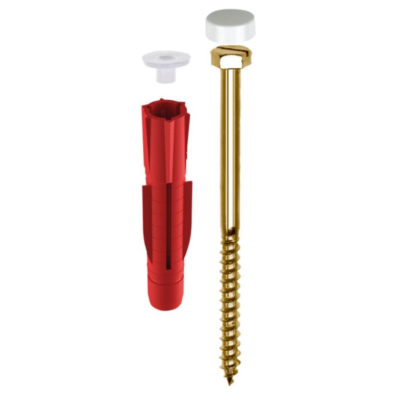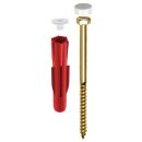 • Zwei Tri-Dübel (8/51), zwei Kunststoff-Unterlegscheiben mit Bund, Messing-Sechskantschraube (SW 10) und Abdeckkappen weiß und/oder verchromt