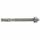 Der Upat Expressanker IMC ist im Bereich der Bolzenanker der preiswerte Spezialist. Dieser Stahlanker, in galvanisch verzinkter Ausführung, ist besonders geeignet für die Befestigung mittelschwerer bis schwerer Lasten im Innenbereich in ungerissenem Beton und Naturstein mit dichtem Gefüge. Der Expressanker IMC bietet durch die 2 Verankerungstiefen Montageflexibilität und kann in Vor- und Durchsteckmontage gesetzt und mit dem Hammer in das ausgeblasene Bohrloch eingeschlagen werden. Beim Anziehen der Mutter schiebt sich der Bolzen in den Spreizclip, der sich gegen die Bohrlochwand verspreizt und so für eine hohe Haltesicherheit sorgt. Besonders häufig wird der Bolzenanker für die Befestigung von Kabeltragsystemen und Treppengeländern verwendet. | Eigenschaften: Werkstoff: Stahl, Oberfläche: verzinkt, Ausführung: mit Standardscheibe, Bohrernenndurchmesser: 20, Gesamtlänge: 184, Gewinde: M 20 mm, Gewindelänge: 90, Kopfprägung: F, max. Nutzlänge: 30, min. Bohrlochtiefe: 165, min.