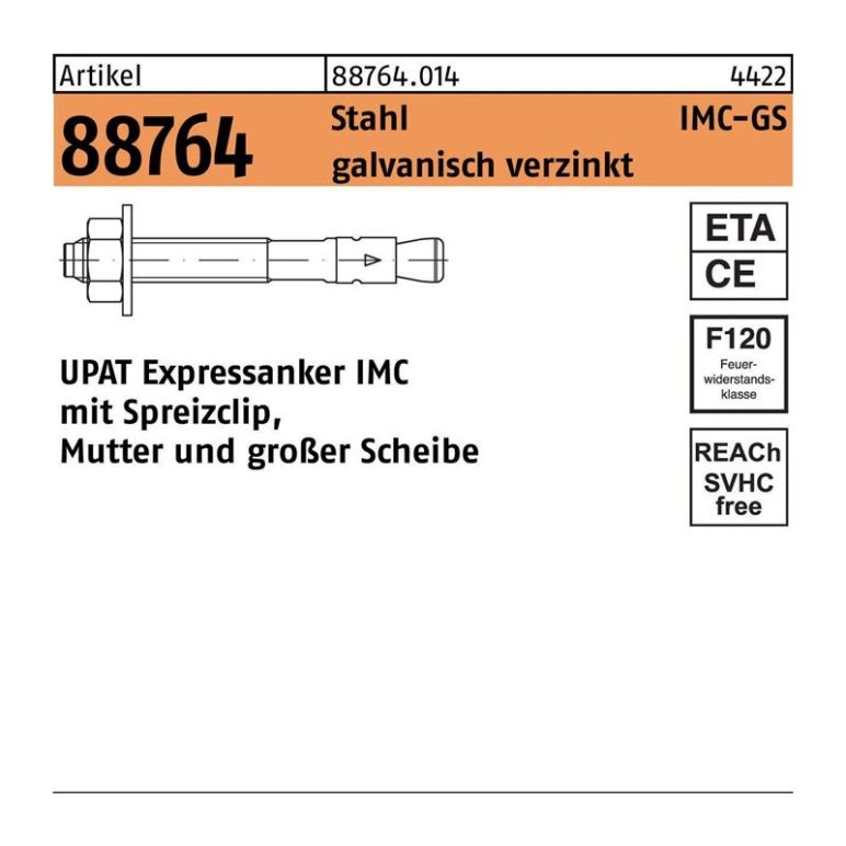 Expressanker R 88764 IMC 12/140/236 GS Stahl galv.verz. 10 Stück UPATArtikel 88764 Stahl IMC-GS galvanisch verzinkt UPAT Expressanker IMC mit 1 Spreizclip · Mutter und großer Scheibe - Abmessung: 12/140/236 GS VE=S (10 Stück) Weitere technische Eigenschaften: · Form: IMC-GS · Gruppencode: 88764.014 · Länge: 236 mm · Norm: REYHER-Artikel 88764 · Oberfläche: galvanisch verzinkt