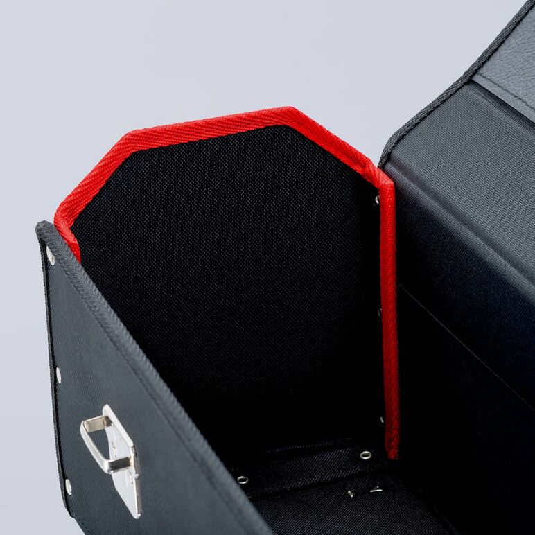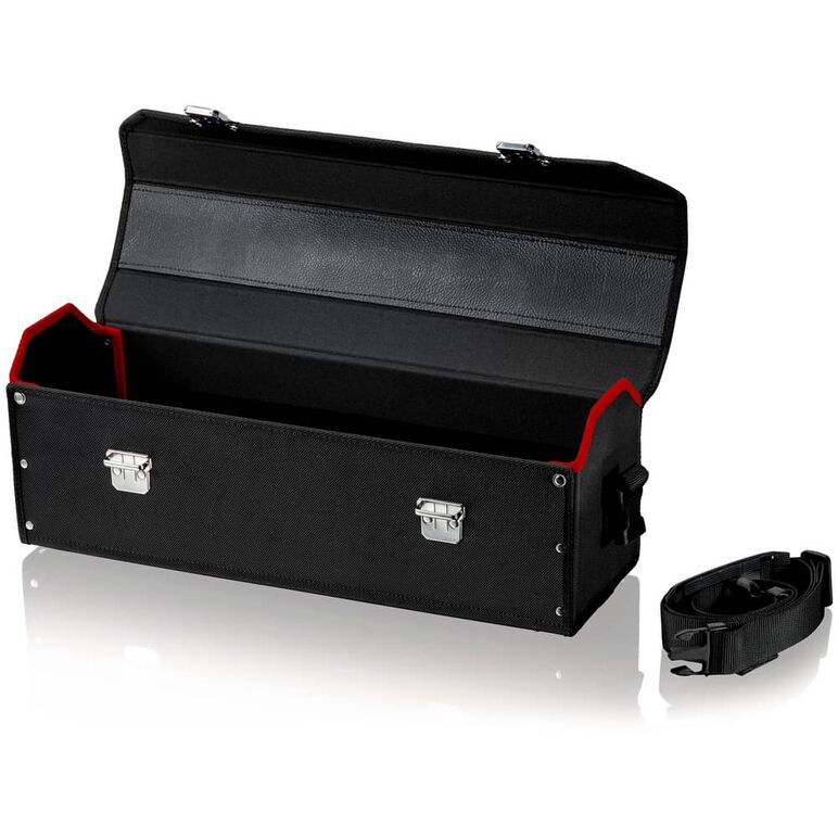 Aus strapazierfähigem Polyester-Gewebe. Für Werkzeuge bis ca. 450 mm Länge. Mit zwei Fächern an der Rückseite. Mit Tragegriff und verstellbarem Schultergurt. Verschlussriemen aus Leder. Tasche ohne Werkzeugbestückung.