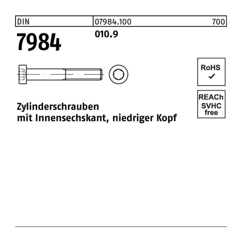 Zylinderschraube DIN 7984 Innen-6kt M5x 20 010.9 500 StückDIN 7984 010.9 Zylinderschrauben mit Innensechskant · niedriger Kopf - Abmessung: M 5 x 20 VE=S (500 Stück) Weitere technische Eigenschaften: · Gruppencode: 07984.100