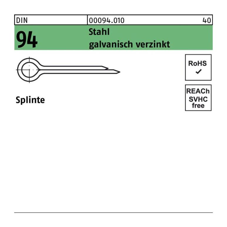 Splinte DIN 94/ISO 1234 2x 25 Stahl galv.verz. 1000 StückDIN 94 Stahl galvanisch verzinkt Splinte - Abmessung: 2 x 25 VE=S (1000 Stück) Weitere technische Eigenschaften: · Durchmesser: 2 mm · Form: Ohne Formfangabe · Gruppencode: 00094.010 · Länge: 25 mm · Oberfläche: galvanisch verzinkt · Produkt-Typbezeichnung: Splinte