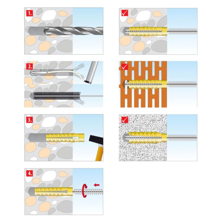 - In Beton und Vollstein (Baustoffe mit hoher Druckfestigkeit) das Bohrloch mit größtmöglich angegebenem Bohrer erstellen