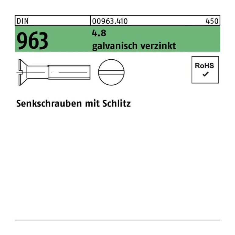 Senkschraube DIN 963 Schlitz M5x 16 4.8 galv.verz. 1000 StückDIN 963 4.8 galvanisch verzinkt Senkschrauben mit Schlitz - Abmessung: M 5 x 16 VE=S (1000 Stück) Weitere technische Eigenschaften: · Ausführung: Senkschrauben mit Schlitz · Gruppencode: 00963.410 · Norm: DIN 963 · Oberfläche: galvanisch verzinkt