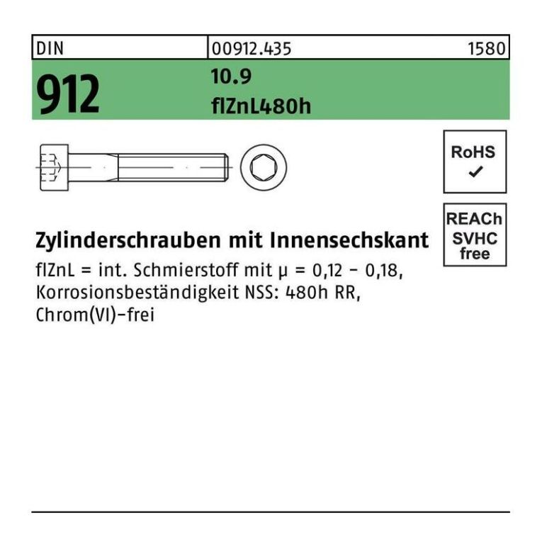 DIN 912 10.9 flZnL 480h (zinklamellenbesch.) Zylinderschrauben mit Innensechskant - Abmessung: M 20 x 110 VE=S (25 Stück) Weitere technische Eigenschaften: · Gruppencode 00912.435 Inhaltsmenge: 25 Stück pro Kartonage Länge 110 Form Ohne Formfangabe Verpackungsgröße 25.00 Werkstoff 10.9 Oberfläche flZnL480h Durchmesser 20 Norm DIN 912 Typenbezeichnung Zylinderschrauben mit Innensechskant