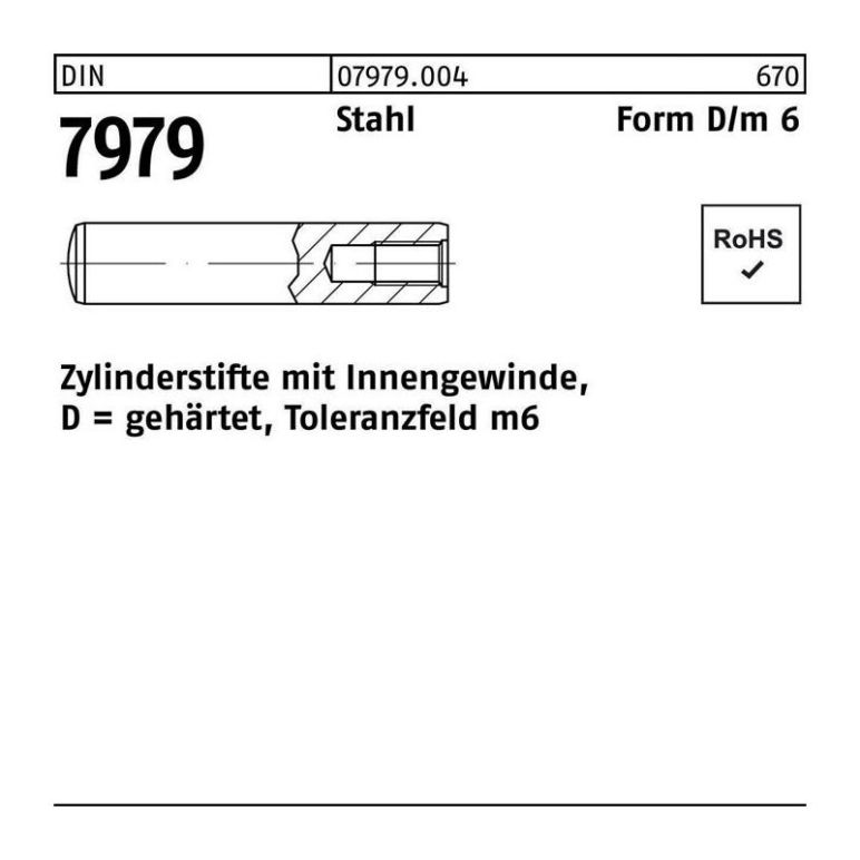 DIN 7979 Stahl Form D/m 6 Zylinderstifte mit Innengewinde · gehärtet · Toleranzfeld m6 - Abmessung: D 6 x 12 VE=S (100 Stück) Weitere technische Eigenschaften: · Gruppencode 07979.004 Inhaltsmenge: 100 Stück pro Kartonage Länge 12 Form Form D/m 6 Verpackungsgröße 100.00 Werkstoff Stahl Durchmesser 6 Oberfläche Ohne Oberflächenangabe Norm DIN 7979 Typenbezeichnung Zylinderstifte mit Innengewinde, D = gehärtet, Toleranzfeld m6