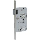 Einsteckschloss für WC Türen nach DIN 185251-1, Klasse 1 integrierte Schlosstaschenabstützung stabilisiert die Schlosstasche Nuss aus hochwertigen Polyamid Falle und Riegel aus Kunststoff Schlosskasten allseitig geschlossen, verzinkt beim Zuziehen der Tür wird ausschließlich die Falle betätigt, Fallenausschluss 10 mm durch Verschließen wird der Riegel ausgeschlossen, Riegelausschluss 10 mm ES WC L S 55 78 20