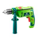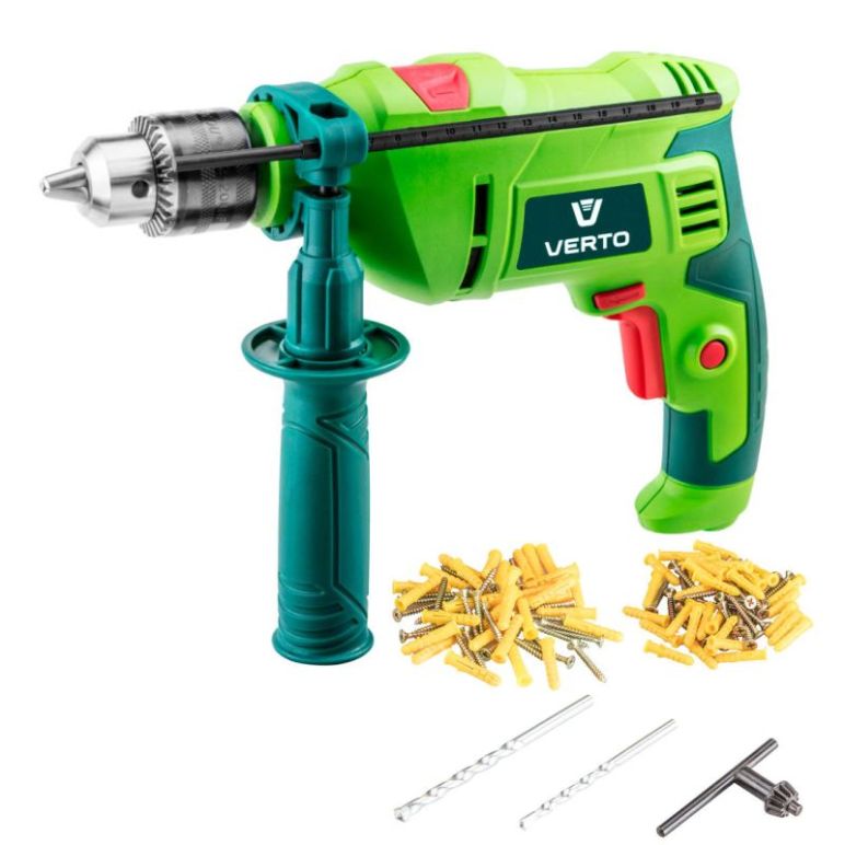 Schlagbohrmaschine 1050W + Zubehör von Verto Die Schlagbohrmaschine von Verto verfügt über Funktionen zum Bohren und Schlagbohren. Mit einer Leistung von 1050 W können Löcher mit einem Durchmesser von bis zu 40 mm in Holz, 16 mm in Beton und 13 mm in Stahl gebohrt werden. Die Bohrmaschine verfügt über einen Rechts- / Links-Richtungswahlschalter, eine Einstellung der Schrittgeschwindigkeit und eine Dauerbetriebssperre. Es ist mit einem langen Netzkabel für den freien Betrieb des Werkzeugs ausgestattet. Der ergonomische Griff verbessert den Komfort und die Sicherheit bei der Arbeit. Das Werkzeug wird mit zusätzlichem Seitengriff und Bohrtiefenmessstab geliefert. Besonderheiten: 1050W Spannfutter 13 mm Drehzahl 0-3000 min-1 Schlagzahl 0-48000 min-1 Rechts / links Bohrdurchmesser in Holz / Beton / Stahl 40/16/13 mm Spindelgewinde 1/2 '' x 20 mm Gewicht 2,2 kg Zubehör: Schlüssel, Zusatzhandgriff + Zubehör 2 Jahre Herstellergarantie Garantieinformation