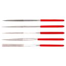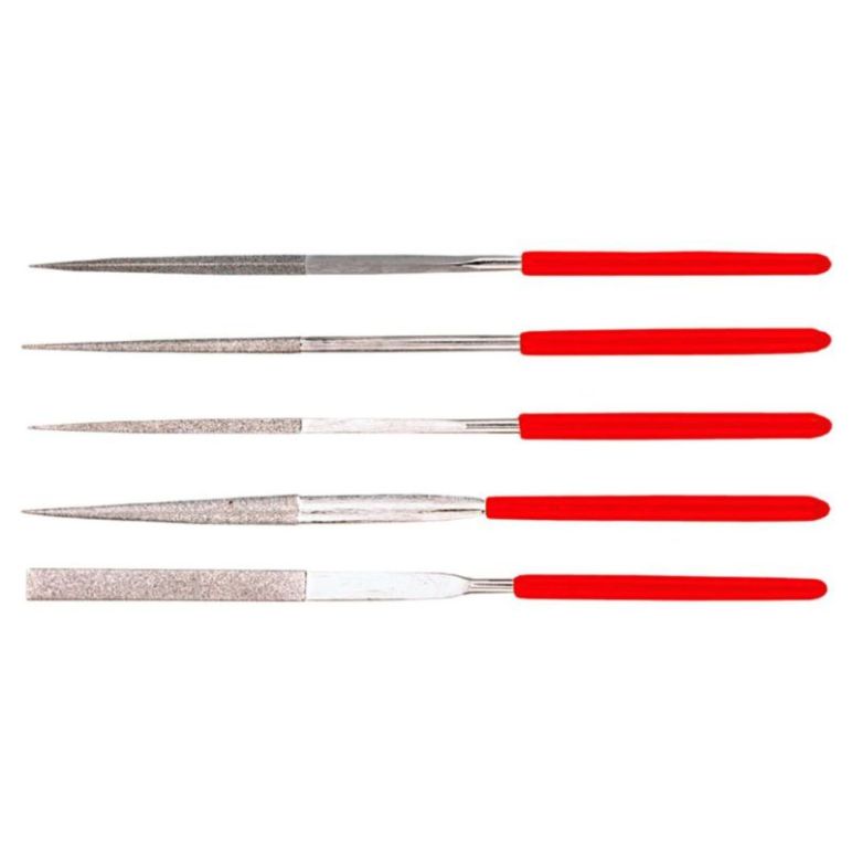 Diamant Nadelfeilen 140 mm 5-tlg. Das besondere an diesen Nadelfeilen ist das Sie sowohl zum Schleifen und Glätten aber auch zum Feilen und Schärfen verwendet werden können. Durch Ihren geringen Durchmesser von 4 mm kommen Sie auch gerne beim Basteln zum Einsatz. Der Gummierte Griff ermöglicht gute Handling und Beschichtet sind diese Feilen mit einer Galvanisch abgeschiedene Diamantabdeckung. Besonderheiten auf einen Blick:     • Galvanische Diamantabdeckung (elektrochemisch abgeschiedene Nickelschicht auf Stahlgrundkörper)     • 5 Teilig     • 140 mm x 4 mm     • Vielseitig Einsetzbar     • Gummierter Griff Weitere Feilen für Metall oder Holz finden Sie auf unserer Website mit einem Klick auf hier.