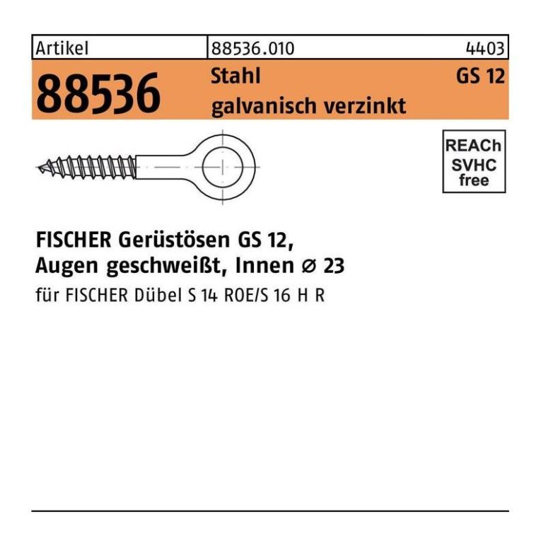 Artikel 88536 Stahl GS 12 galvanisch verzinkt FISCHER Gerüstösen GS 12 · Augen geschweißt · Innen Ø 23 - Abmessung: GS 12 x 230 VE=S (25 Stück) Weitere technische Eigenschaften: · Ausführung: FISCHER Gerüstösen GS 12, Augen geschweißt, Innen Ø 23 · Gruppencode 88536.010· Länge 230mm· Normart REYHER-Artikel 88536· Oberfläche galvanisch verzinkt Inhaltsmenge: 25 Stück pro Kartonage Material Stahl Verpackungsgröße 25.00 Typ GS 12 Schrauben-Ø 12
