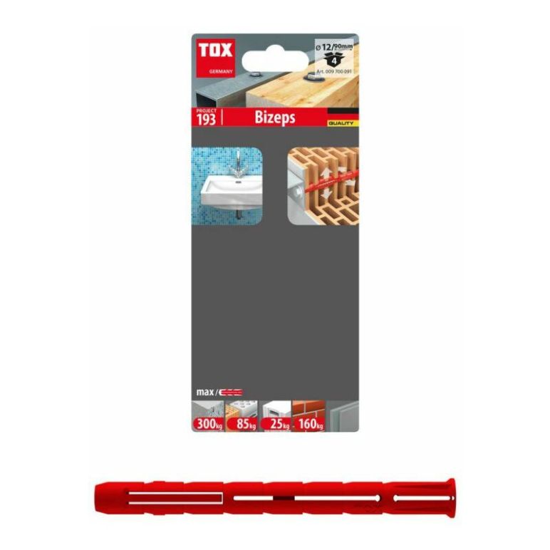 TOX Parallel-Spreizdübel Bizeps 12/90 Blister - 4 Stück - 9700091 Parallel-Spreizdübel Bizeps 12/90 Blister - 4 Stück von TOX, mit der Art-Nr.: 9700091 und der EAN: 4049563000528 Eigenschaften Ideal für Lochstein (Poroton) und Porenbeton (Ytong) Extrem hohe Haltewerte Spreizt in mehreren Richtungen Drehflügel verhindern das Mitdrehen im Bohrloch 100% Nylon Langer Spreizbereich für sichere Verankerung Auch für metrische Gewindestangen geeignet Beschreibung & Einsatzbereich Mehrfachspreizung durch zwei 2-fach geteilte, um 90° zueinander versetzte Spreizkörper mit beweglichen Drehflügeln und flexiblem Dübelhals Große Verankerungstiefe Verarbeitung & Montage Bohrloch in der Größe des Dübeldurchmessers erstellen In Lochstein und Gipskartonplatten ohne Schlag im Drehgang bohren, damit die Stege im Lochstein nicht ausbrechen Das Bohrloch in Gipskartonplatten ist mit einem Holzoder Metallbohrer zu erstellen In Beton und Vollstein mit Schlag bohren Mindest-Schraubenlänge = Dübellänge +