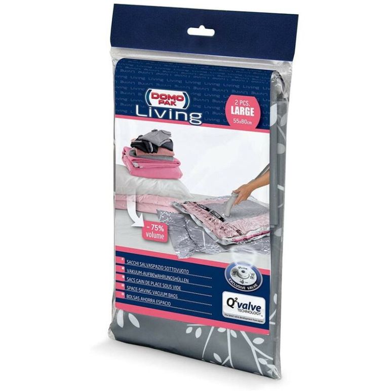Domopak platzsparende Vakuumkoffer 55x80 cm 2er-Set Große vakuumverpackte platzsparende Etuis mit den Maßen 55 x 80 x 0,2 cm. Ausgestattet mit dem exklusiven Q2-Ventil, das maximale Geschwindigkeit und Komfort gewährleistet, da es mit jedem Staubsauger funktioniert. Die Tasche hat eine schön verzierte Seite und eine transparente Rückseite, um den Inhalt zu erkennen. Es besteht aus einem mehrschichtigen Material, das Festigkeit, maximale Abdichtung und Haltbarkeit garantiert. Das Scharnier ist für eine sichere und mehrfache Verwendung doppelt verschweißt. Packungsinhalt 2 platzsparende Vakuumbeutel - Groß Transparente Farbe