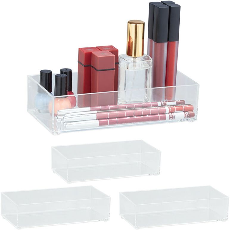 4 x Schubladen Organizer, Make Up, Schmink- u. Schreibtisch, Büro, Küche, Kunststoff, hbt 5x19x9,5 cm, transparent