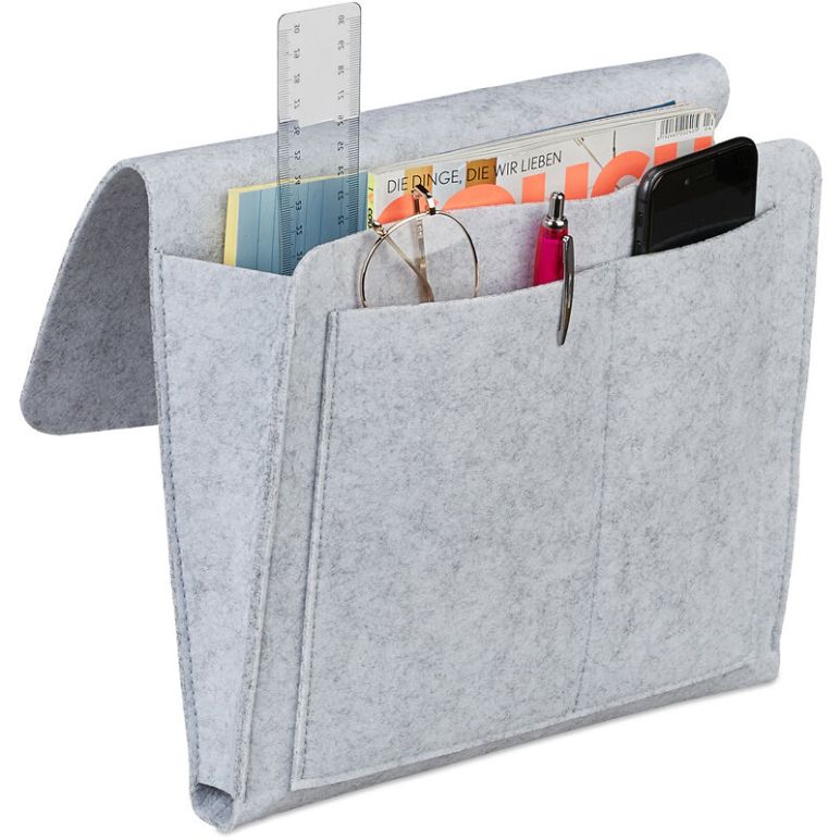 Betttasche, zum Einhängen, 5 Fächer, Aufbewahrung Bett & Sofa, Filz Bettorganizer hbt 26 x 28 x 5 cm, hellgrau - Relaxdays