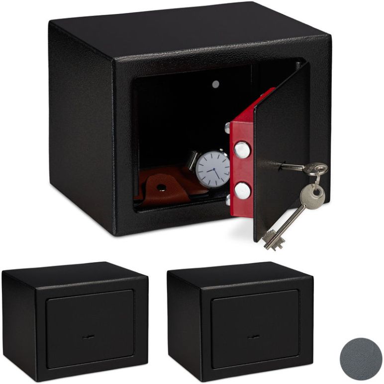3 x Möbeltresor mit Schlüssel, Doppelbartschloss, Befestigung Wand oder Boden, Minisafe, HxBxT: 17 x 23 x 17, schwarz