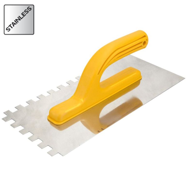 Zahnkelle für den Einsatz im Bauhandwerk bei Maurer- und Fliesenarbeiten Für leichte Handhabung sorgt der profilierte Kunststoffgriff. Material- rostfreier Edelstahl Maße: 270x130mm Zahnung: 4, 8 oder 10mm säurebeständig profilierter Kunststoffgriff