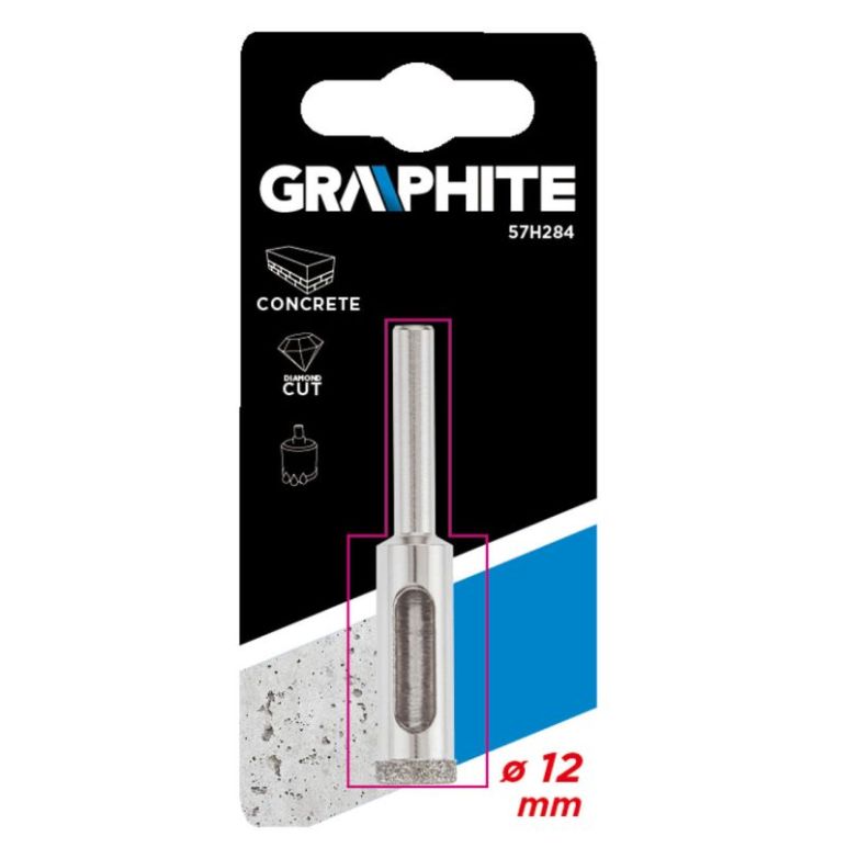 Mit Hilfe dieser Diamantbohrkrone kann man alles durchbohren ! Die Diamantbohrkrone von der Marke Graphite macht das Bohren von Löchern in sehr harten keramischen und mineralischen Werkstoffen (Kies, Granit, Marmor) möglich. Dies wird durch die Klinge ermöglicht, welche einen galvanisch abgeschiedenen Diamantkorn besitzt. Technische Daten: durchbohrt keramische und mineralische Werkstoffe (Kies, Granit, Marmor) Klinge besitzt einen galvanisch abgeschiedenen Diamantkorn Maße: 8-83 mm Farbe: grau Hersteller: Graphite Durchmesser Maße Gewicht 8 mm 13 x 7,5 x 1,3 cm 0,02 kg 10 mm 13 x 7,5 x 1,3 cm 0,02 kg 12 mm 13 x 7,5 x 3 cm 0,02 kg 25 mm 13 x 7,5 x 3 cm 0,07 kg 32 mm 13 x 7 x 5 cm 0,1 kg 35 mm 13 x 7 x 5 cm 0,1 kg 40 mm 13 x 7 x 5 cm 0,12 kg 65 mm 13 x 9,5 x 7 cm 0,22 kg 83 mm 13 x 11 x 8,5 cm 0,3 kg