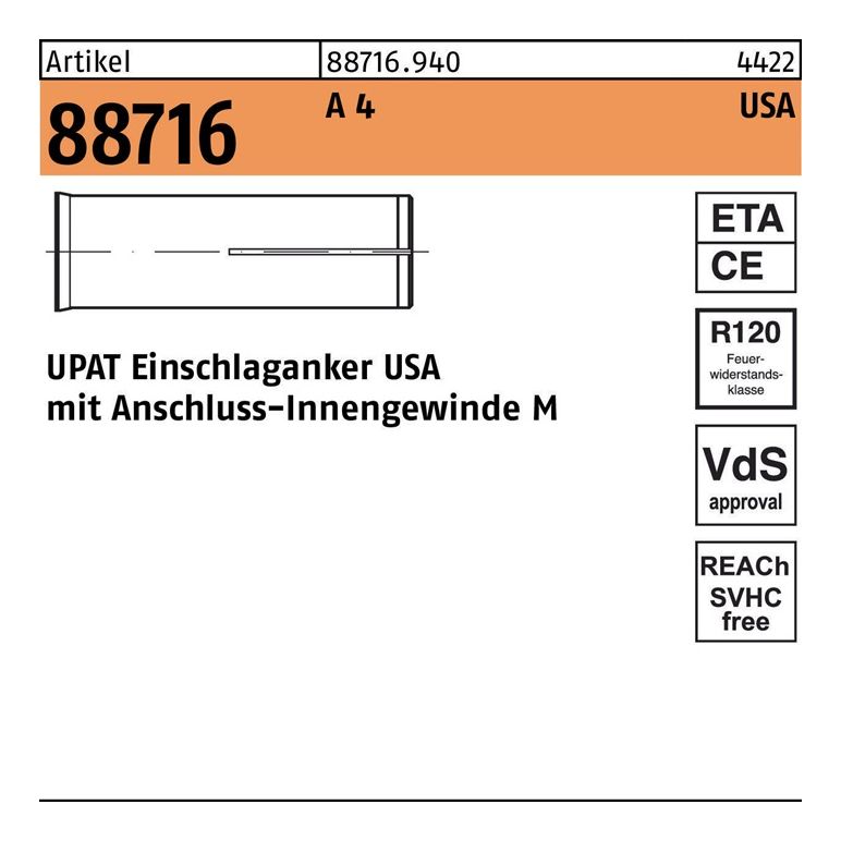 Artikel 88716 A 4 USA UPAT Einschlaganker USA mit Anschluss-Innengewinde M - Abmessung: USA M 10 VE=S (50 Stück)Weitere technische Eigenschaften:· Gruppencode 88716.940· Normart REYHER-Artikel 88716· Oberfläche Ohne Oberflächenangabe
