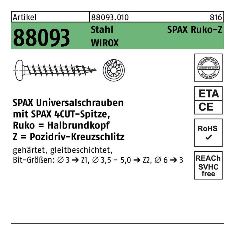 Artikel 88093 Stahl SPAX Ruko-Z Oberfläche WIROX SPAX Universalschrauben mit Spitze · SPAX MULTI-Halbrundkopf · Pozidriv-KS - Abmessung: 3 x 16/15-Z VE=S (1000 Stück)Weitere technische Eigenschaften:· Gruppencode 88093.010· Normart REYHER-Artikel 88093· Oberfläche WIROX