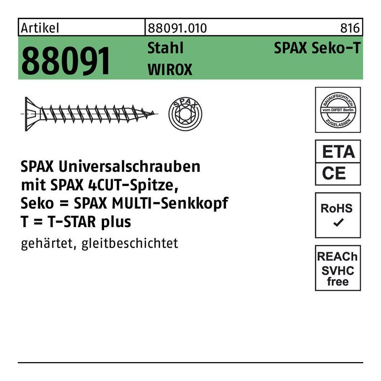 Artikel 88091 Stahl SPAX Seko-T Oberfläche WIROX SPAX Universalschrauben mit Spitze · SPAX MULTI-Senkkopf · T-STAR - Abmessung: 3 x 12/10-T10 VE=S (1000 Stück)Weitere technische Eigenschaften:· Gruppencode 88091.010· Normart REYHER-Artikel 88091· Oberfläche WIROX