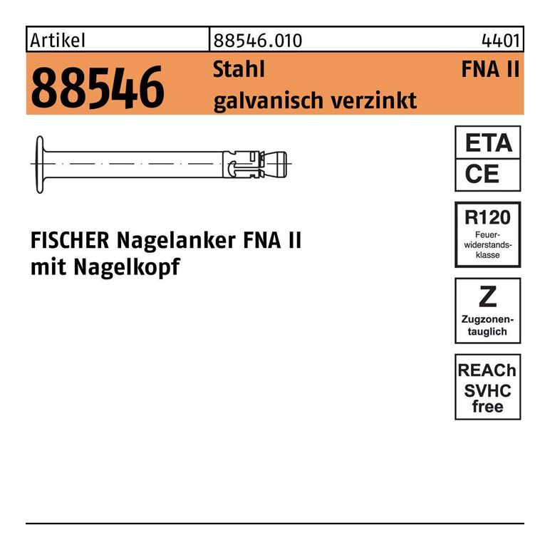 Artikel 88546 Stahl FNA II galvanisch verzinkt FISCHER Nagelanker FNA II mit Nagelkopf - Abmessung: FNAII 6x25/ 5 VE=S (100 Stück)Weitere technische Eigenschaften:· Dübellänge l: 25mm· Gruppencode 88546.010· Normart REYHER-Artikel 88546· Oberfläche galvanisch verzinkt