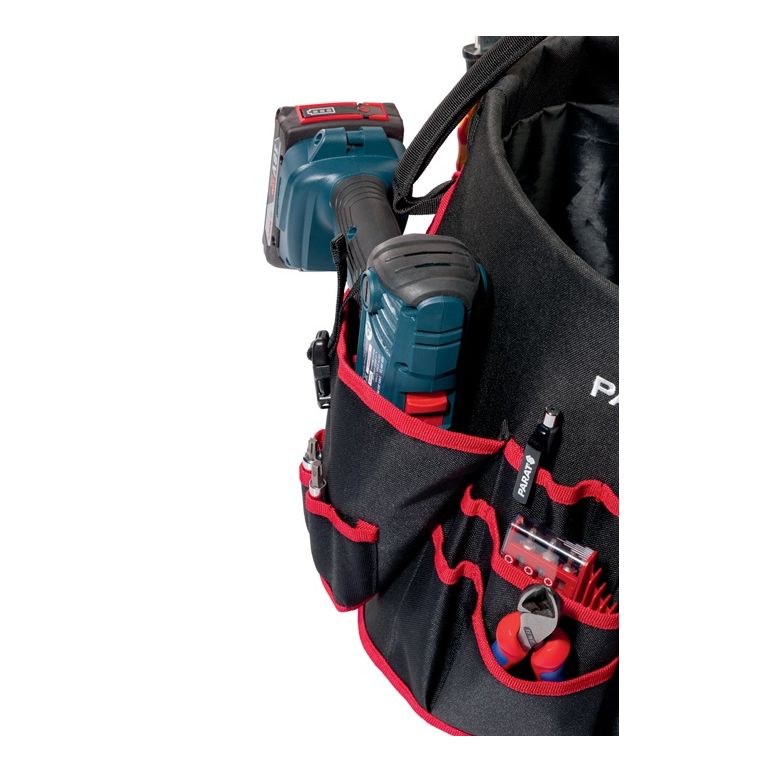 aus hochwertigem Material · geringes Eigengewicht · hohe Tragfähigkeit · praktischer Trage-/Schultergurt · für ca. 62 Werkzeuge · 12 innenliegende Einsteckfächer · 1 großzügiges Hauptfach · 1 separates Fach für einen Akkuschrauber inklusive Steckverschluss · 37 außenliegende Einsteckfächer · weitere separate Fächer für Kleinteile oder SmartphoneWeitere technische Eigenschaften:· Gewicht: 1780g
