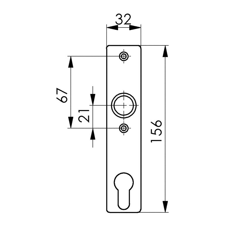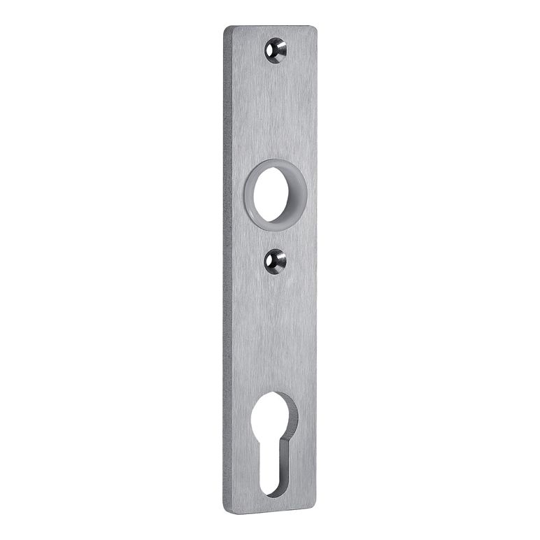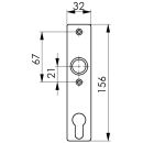 Edelstahl rostfrei · kantige Form · 18 mm Führung · passend für alle Schlosskästen · Edelstahl rostfrei Schrauben werden mitgeliefert · Kurzschild mit 72 mm Entfernung PZ · Schraubenlochabstand 67 mm · Breite 32 mm · Höhe 156 mm · Tiefe 6 mm · inkl. 2 Drückerrosetten für Drücker Ø 16 mm und Ø 18 mmWeitere technische Eigenschaften:· Schraublochabstand: 67mm