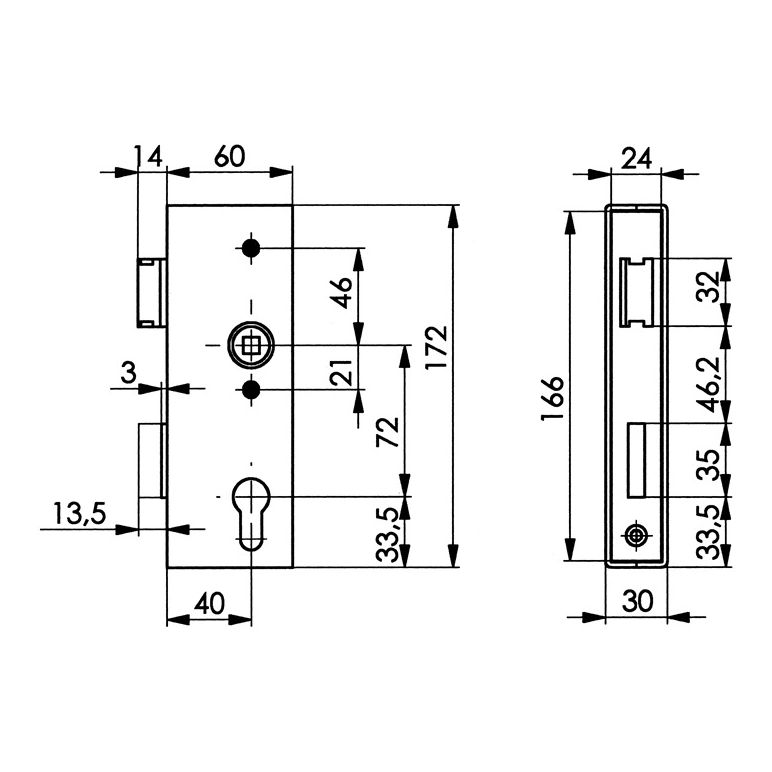 AMF Schlosskasten 141UNIG-30PZ DIN L/R Maß A30xB60xC166mm Dornm.40mm Entf.72mm