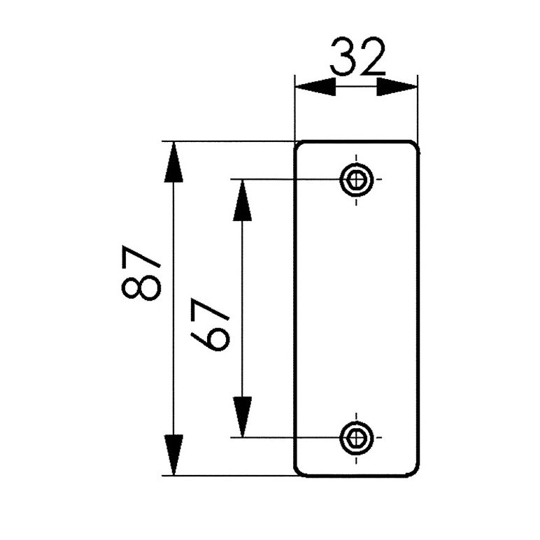 Leichtmetall silberfarbig (F1) · kantige Form ·18 mm Führung · passend für alle Schlosskästen mit 8 mm Nuss · Edelstahl rostfrei Schrauben werden mitgeliefert · Schraubenlochabstand 67 mm · Breite 32 mm · Höhe 87 mm · Tiefe 7 mm · blindWeitere technische Eigenschaften:· Oberfläche: F1 / silberfarbig· Form: kantig