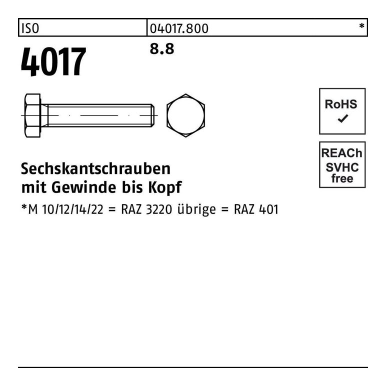 ISO 4017 8.8 Sechskantschrauben mit Gewinde bis Kopf - Abmessung: M 10 x 60 VE=S (100 Stück)Weitere technische Eigenschaften:· l: 60mm· Gruppencode 04017.800· Normart ISO 4017