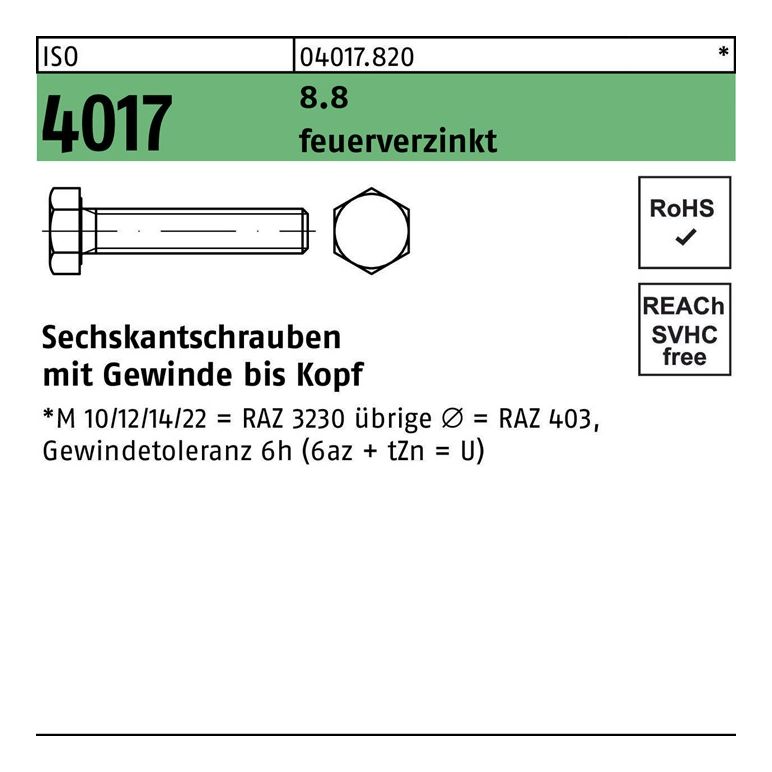 ISO 4017 8.8 feuerverzinkt Sechskantschrauben mit Gewinde bis Kopf - Abmessung: M 16 x 90 VE=S (25 Stück)Weitere technische Eigenschaften:· l: 90mm· Gruppencode 04017.820· Normart ISO 4017