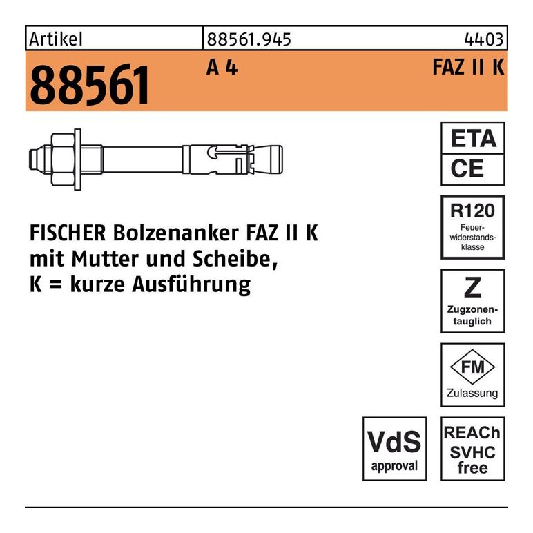 Artikel 88561 A 4 FAZ II K FISCHER Bolzenanker FAZ II K mit Mutter und Scheibe · kurze Ausführung - Abmessung: FAZ II 10/ 10K VE=S (50 Stück)Weitere technische Eigenschaften:· Gruppencode 88561.945· Länge 10mm· Normart REYHER-Artikel 88561
