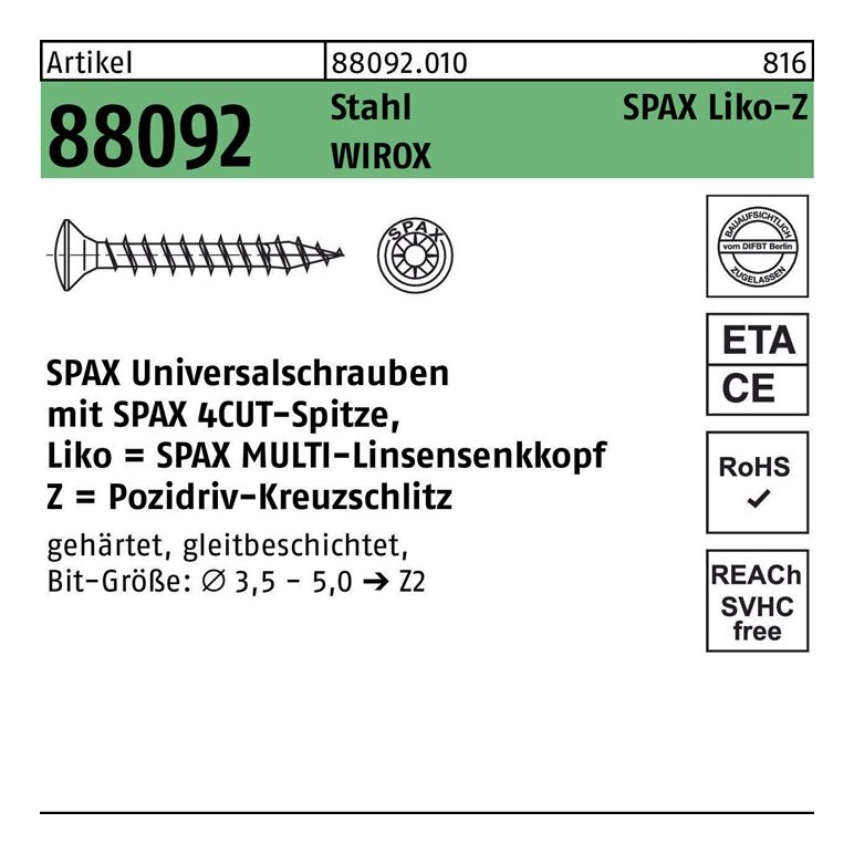Artikel 88092 Stahl SPAX Liko-Z Oberfläche WIROX SPAX Universalschrauben mit Spitze · SPAX MULTI-Linsensenkkopf · Pozidriv-KS - Abmessung: 4 x 30/25-Z VE=S (1000 Stück)Weitere technische Eigenschaften:· Gruppencode 88092.010· Normart REYHER-Artikel 88092· Oberfläche WIROX