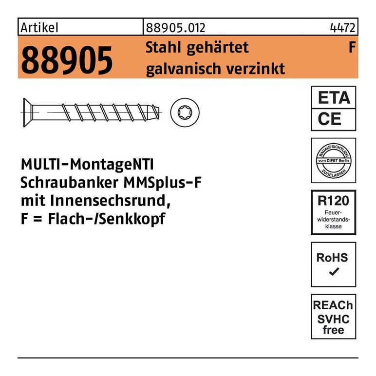 Artikel 88905 Stahl gehärtet MMSplus-F galvanisch verzinkt MULTI-MONTI Schraubanker MMSplus-F Senkkopf mit Innensechsrund - Abmessung: 7,5 x 50 VE=S (100 Stück)Weitere technische Eigenschaften:· Werkstoff: Stahl gehärtet· Durchmesser 7,5mm· Gruppencode 88905.012· Normart REYHER-Artikel 88905· Produkt-Typbezeichnung MULTI-MONTI Schraubanker MMSplus-F mit Innensechsrund, F = Flach-/Senkkopf