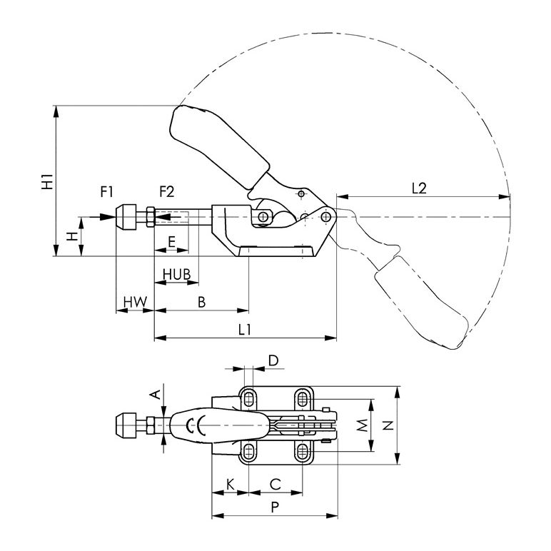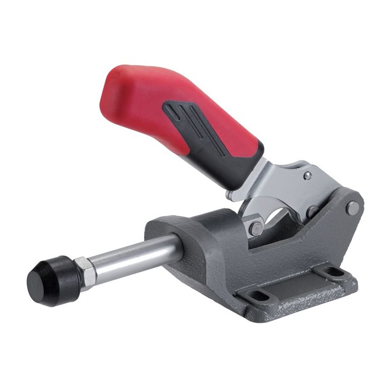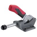 schwer · Druck- und Zugspanner · mit langer Schubstangenführung · Grundkörper aus Temperguss, lackiert · Hebelteile und Schubstange aus Vergütungsstahl, verzinkt und passiviert · Niete aus nicht rostendem Stahl, die bei Größe 3 in einsatzgehärteten Lagerbuchsen laufen · Lagerstellen gefettet · Handgriff aus rotem, ölbeständigem Kunststoff · bei Größe 3 und 5: ergonomischer, ölbeständiger Handgriff mit großer Handauflage und weicher Komponente · komplett mit vergüteter, verzinkter AndrückschraubeWeitere technische Eigenschaften:· A: 22mm· C: 70mm· D: 11mm· M max.: 65mm· M min.: 57mm· L1: 218mm· H1: 179mm· F1: 25kN· Gesamthöhe: 180mm· B max.: 105mm· Bohrungs-Ø: 11 mm· F2: 25kN· B min.: 59mm· P: 158mm· Eigenschaft: schwer, Druck-/Zugspanner· K: 45mm· E: 50mm· H: 55mm· N: 93mm· Gesamtlänge: 218mm