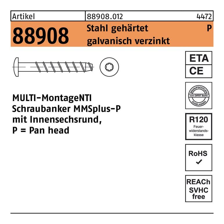 Artikel 88908 Stahl gehärtet MMSplus-P galvanisch verzinkt MULTI-MONTI-Schraubanker MMSplus-P Rundkopf mit Innensechsrund - Abmessung: 10 x 60 VE=S (25 Stück)Weitere technische Eigenschaften:· Werkstoff: Stahl gehärtet· Durchmesser 10mm· Gruppencode 88908.012· Normart REYHER-Artikel 88908· Produkt-Typbezeichnung MULTI-MONTI Schraubanker MMSplus-P mit Innensechsrund, P = Pan head