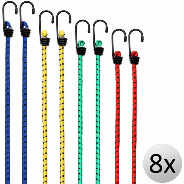 Diese hochwertigen Spanngummis sind vielseitig einsetzbar und im Alltag unverzichtbar. Sie finden unter anderem Anwendung bei der Abdeckung mit Planen, beim Bootsausflug oder als Fahrrad Zubehör.Des Weiteren eignen sie sich hervorragend bei Outdoor Aktivitäten wie Camping oder zur Sicherung von Gartenmöbeln bei starkem Wind. Auch beim Aufhängen von Werbebannern oder Gerüstbannern, sowie jeder Menge anderer Befestigungs- und Halteaufgaben bieten die Gummispanner perfekten Halt. Das Set beinhaltet 4 verschiedene Längen, wodurch Sie für die jeweilige Situation stets die passende Länge zur Hand haben. Die Gummispannseile bestehen aus widerstandsfähigem und witterungsbeständigem Material. Zum Schutz vor Verletzungen und Beschädigungen sind die strapazierfähigen Metallhaken mit einem Gummischutz versehen. Produktvorteile: 8er Set 4 verschiedene Längen vielseitig einsetzbar widerstandsfähig und witterungsbeständig strapazierfähige Metallhaken Gummischutz an Haken Im Set enthalten: 2x 100cm