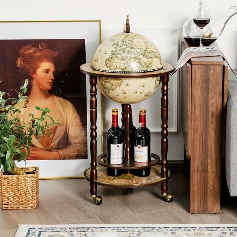 Schönes Design.Mit dem schönen Gemälde ist die Globusbar ein echter Bilckfang. Die Minibar ist eine perfekte Kombination von Aufbewahrungsfunktion und Ästhetik. Einfache Bewegung.Mit 3 Rollen ist die Globusbar bequem und einfach zu bewegen und zu transportieren. Praktisch.Viel Platz für Wein, Schnaps, Getränke und Stängelgläser, bringt dabei Ihre Sachen im verdeckten Platz in Ordnung. Der Servierwagen eignet sich für die Nutzung in der Küche, Bar, im Wohnzimmer, auch in anderen Räumen oder auf der Terrasse. Der Allzweckwagen kann Ihre unterschiedlichen Bedürfnisse gut erfüllen. Bodenplatte.Sie können die Flaschen auf die untere Bodenplatte legen. Durch die Halterung bei dem Haushaltswagen wird genügender Stauraum geboten und die Ordnung ist garantiert. Robuste und stabile Konstruktion.Der Barwagen ist aus Massivholz hergestellt, robust und langlebig sowie sorgt für eine ausgezeichnete Stabilität. Beschreibung: Diese elegante Globusbar eignet sich hervorragend für mehrere Flaschen