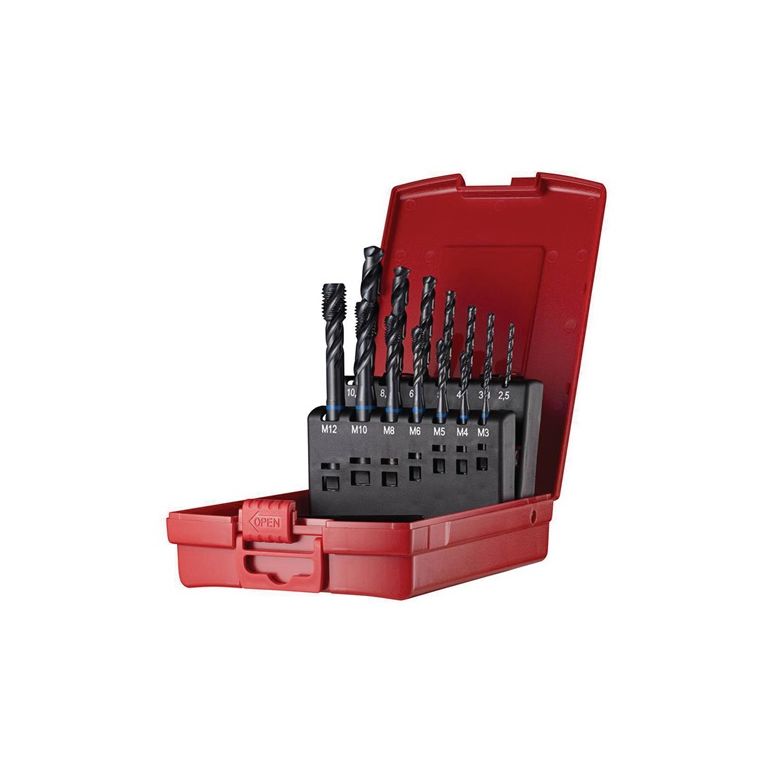 Kernlochbohrer + Gewindebohrer-Set Nr.305 ( 14 teilig ) in Standard Kunststoffkasette zum herstellen ISO- Metrischer Gewinde von M3 bis M12 · bestehend aus 7 HSS-E-PM vaporisierten spiral genuteter gewindebohrer E238 · Anschnittform C mit 2-3xP Gewindeanschnitt · 7 HSS vaporisierten Spiralbohrern mit Zylinderschaft A108 für einen empfohlenen vorbearbeiteten Lochdurchmesser 2.5xD Sacklochgewinde in EdelstahlWeitere technische Eigenschaften:· Inhalt: 14· Typ: W· Norm: DIN 338· Schneidstoff: HSS-E PM