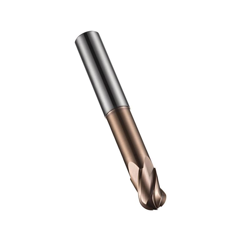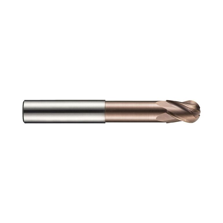Extra kurzer kugelfräser mit 4 Schneiden · Durchmesser 12mm mit 16mm Schnittlänge · 100mm Gesamtlänge · 60mm erreichbare Lämge mit Halsfreischliff und 6mm Vollprofilradius · gemäß DORMER Standard mit einem 12mm Zylinderschaft · VHM mit TiSiN Beschichtung · 30° Helix und -10° Spanwinkel zum Kopierfräsen in gehärtete MaterialienWeitere technische Eigenschaften:· Schafttoleranz: h6· Drallwinkel: 30