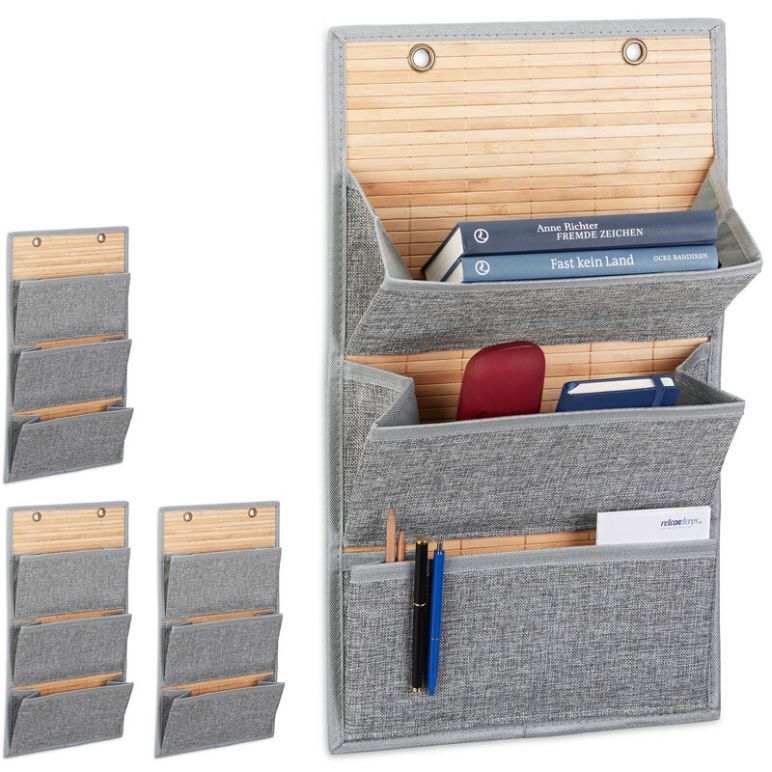 Ein überfüllter Arbeitsplatz oder eine unübersichtliche Garderobe gehören mit dem Wandorganizer aus Bambus der Vergangenheit an. Die praktische Hängeaufbewahrung für Wand und Tür bietet Platz für Zeitschriften, Post, Brieftaschen, Sonnenbrillen und Mützen. Dabei nimmt der Organizer mit 34 cm Breite selbst wenig Raum ein. Nutzen Sie den Türorganizer im Arbeitszimmer für Unterlagen oder im Flur für Accessoires. Die Wandaufhängung aus Bambus und Polyesterstoff ist auch für das Badezimmer geeignet. Wandorganizer Bambus im Detail - Maße: ca. 58 x 34 x 15 cm (H x B x T) - Gewicht: ca. 0,5 kg - Fächer: 3 - Fächergröße: 14 x 32 x 15 cm (H x B x T) - Fächerabstand: 1 cm - Im 4er Set Alles verstaut im Wandorganizer - Einfache Montage über 2 Ösen - Robuste Materialien Bambus und Polyester - Geeignet für Flur, Büro und Bad - Ideal auch für Kinder- und Schlafzimmer - Dezentes Design passt in jeden Raum Lieferumfang - 4x Wandorganizer 3 Fächer - Dekoartikel sind nicht im Lieferumfang enthalten