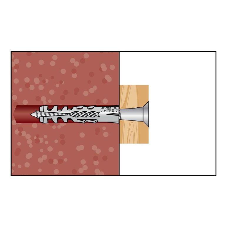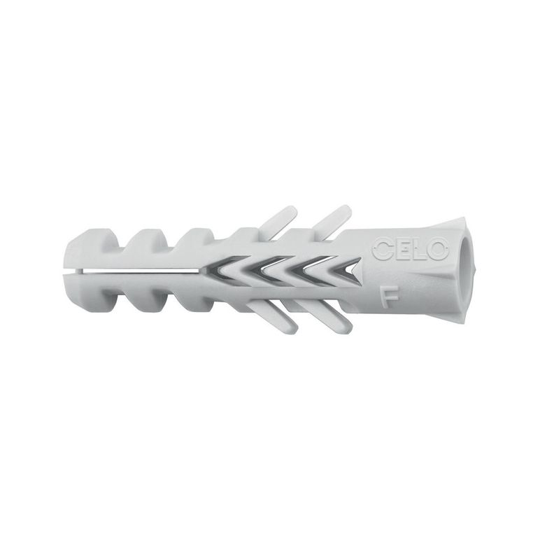 Hohe Auszugswerte werden aufgrund der starken Spreizfähigkeit mit dem CELO Normaldübel F erreicht. Der Nylondübel ist in einem großen Sortiment in den Durchmessergrößen 4-20mm verfügbar. Er ist ideal geeignet für Vollbaustoffe · erreicht aber auch gute Lastwerte in Lochsteinen und Porenbeton. Durch seine sehr gute Schraubenführung kann die Schraube nicht seitlich aus dem Dübel austreten. Die ausgeprägten Flügel verhindern wirksam das Mitdrehen im Bohrloch. Zudem verhindert die stabile Formgebung das Abknicken beim Einschlagen.Weitere technische Eigenschaften:· Temperaturbereich: -40-80°C· Anwendungsbeispiele: Lampen, Elektroschalter, Wandregale, Hängeschränke, Briefkästen, Gardinenschienen, Sanitärbefestigungen, Handläufe, TV-Halterungen, Bilder· Marketingclaim: Der Klassiker für Vollbaustoffe· Materialeignung: Beton, Naturstein, Vollziegel, Kalksand-Vollstein, Vollstein aus Leichtbeton, Porenbeton, Gips-Wandbauplatten· Vorteile: Hohe Auszugswerte aufgrund starker Spreizfähigkeit (vierseitige Spreizung im mittleren Bereich), Ideal geeignet für Vollbaustoffe, erreicht aber auch gute Lastwerte in Lochsteinen und Porenbeton, Sehr gute Schraubenführung, d. h. die Schraube kann nicht seitlich aus dem Dübel austreten, Verfügbar in einem großen Sortiment in den Durchmessergrößen 4-20mm, Hohe Verdrehsicherheit durch ausgeprägte Flügel, Stabile Formgebung verhindert Abknicken beim Einschlagen, Sehr gute Schraubenführung, d. h. die Schraube kann nicht aus dem Dübel seitlich austreten, Hohe Verdrehsicherheit, Gute Lastwerte auch in Lochsteinen und Porenbeton