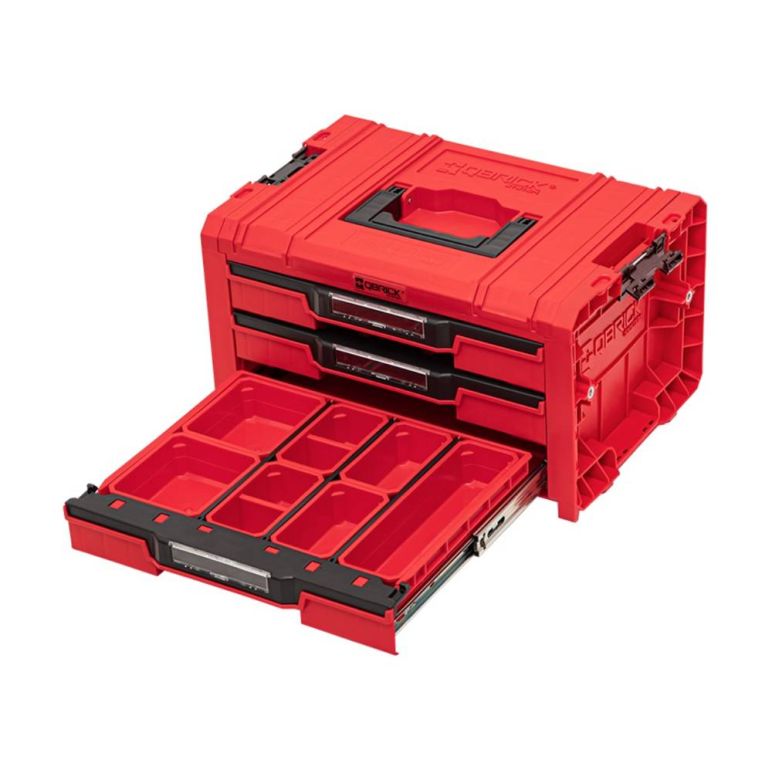 Der Qbrick System PRO Drawer 3 Toolbox ist ein geräumiger, modularer Werkzeugkasten mit drei ausziehbaren Schubladen auf Metallschienen. Eine praktische Taste ermöglicht den einfachen Zugriff auf ihren Inhalt. Die Expert-Version der Schublade ist mit 9 verstellbaren Trennwänden und 21 Fächern (7 auf jedem Fachboden) ausgestattet, um sowohl das längliche als auch das kleine Werkstattzubehör zu organisieren. Die seitlichen Anschlüsse aus Polyamid ermöglichen eine einfache Verbindung mit anderen Modulen der PRO- und ONE-Linien (mit Vario-Abdeckungen und Multi-Adaptern). Dank des komfortablen Griffs lassen sich die Werkzeuge bequem tragen. Die Identifizierung des Inhalts wird durch ein Etikettenfeld gewährleistet, das durch eine Polycarbonatkappe geschützt ist. Eine automatische Schubladensperre, die das Herausziehen der Schubladen verhindert, garantiert einen hohen Komfort der Kommode. RED ULTRA HD ist eine Sonderedition von Qbrick System PRO-Produkten aus ultrabeständigem Kunststoff, der sich durch außergewöhnliche Beständigkeit gegen mechanische Beschädigungen auszeichnet.