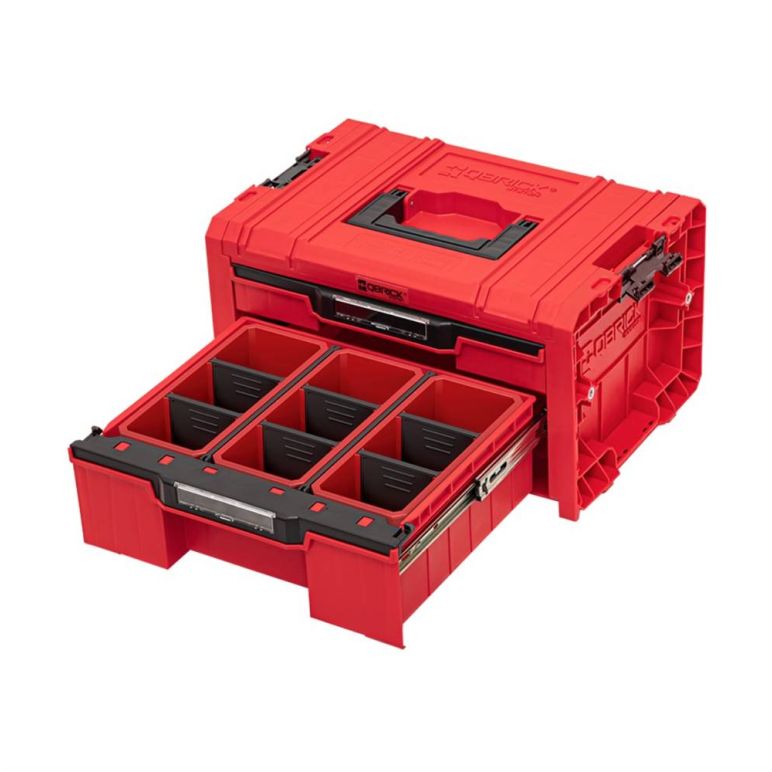 Der Qbrick System PRO Drawer 2 Toolbox Expert ist ein geräumiger, modularer Werkzeugkasten, der mit zwei ausziehbaren Schubladen auf Metallschienen ausgestattet ist. Eine praktische Taste ermöglicht den einfachen Zugriff auf ihren Inhalt. Die Expert-Version der Schubladen ist mit 6 verstellbaren Trennwänden und 10 Fächern ausgestattet, 7 auf der oberen Ebene und 3 tiefe Fächer mit Trennwänden auf der unteren Ebene. Die Fächer auf der oberen Ablage ermöglichen die Organisation von langem und kleinem Werkstattzubehör. Die tiefen Fächer im unteren Regal haben zusätzliche Fächer, drei pro Fach. Die seitlichen Anschlüsse aus Polyamid ermöglichen eine einfache Verbindung mit anderen Modulen der PRO- und ONE-Linien (mit Vario-Abdeckungen und Multi-Adaptern). Dank des komfortablen Griffs lassen sich die Werkzeuge bequem tragen. Die Identifizierung des Inhalts wird durch ein Etikettenfeld gewährleistet, das durch eine Polycarbonatkappe geschützt ist. Eine automatische Schubladensperre, die das Herausziehen der Schubladen verhindert, garantiert einen hohen Komfort der Kommode. RED ULTRA HD ist eine Sonderedition von Qbrick System PRO-Produkten aus ultrabeständigem Kunststoff, der sich durch außergewöhnliche Beständigkeit gegen mechanische Beschädigungen auszeichnet.