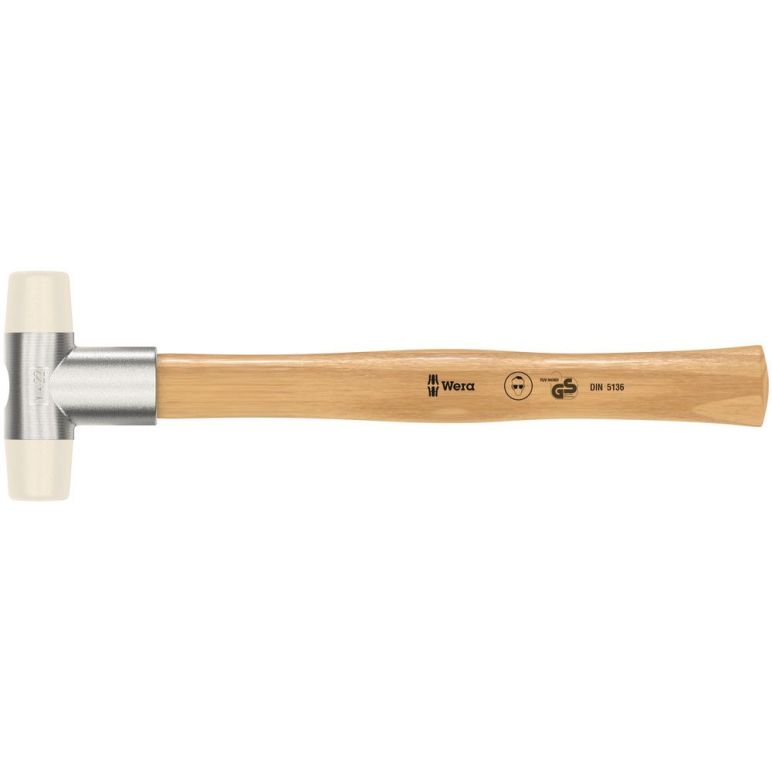 Wera Schonhammer: Zweiseitig konische Konstruktion für eine sichere unlösbare Verbindung zwischen Hammerstiel und Kopf. Hammerkopf aus sehr hartem Nylon. Stiel aus hochwertigem Eschenholz. Variabler Einsatz dank nachrüstbarer Schonhammerköpfe. Für Blechbearbeitung, Ausbauarbeiten, Zelt, Hallen- und Messebau.